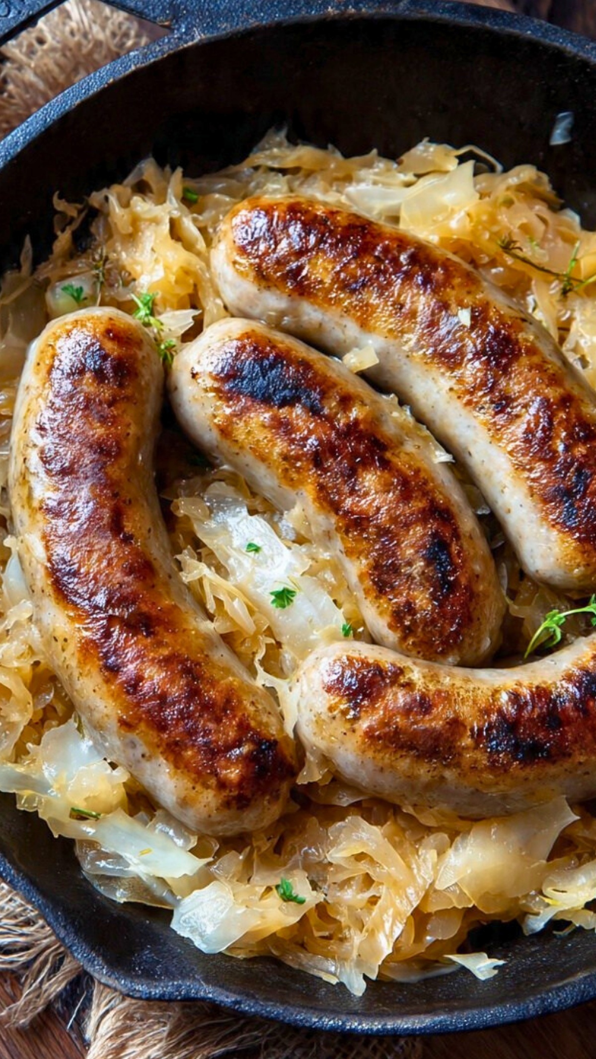 - Nestle the bratwurst back in. Place the browned bratwurst links into the sauerkraut mixture, tucking them down so they’re mostly surrounded by the liquid and veg. This helps them cook evenly and soak up flavor rather than just steaming on top.